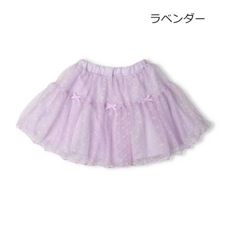 ふんわりボリュームのあるチュールスカート。リボンのモチーフ付き。ラベンダーは花柄、ピンクはラベンダーカラー。同じチュールを使ったTシャツ(N46878)とセットアップで着るのもオススメ!普段のお出かけにも特別な日のお洒落にもピッタリの1枚。【アイテム】ナチュラル シンプル ベーシック フェミニン ガーリー 無地 カジュアル お洒落 オシャレ かわいい 大人可愛い 普段着 デイリーウェア お出かけ着 お外着 外遊び着 ボトムス 子ども こども 女児 女の子 ガールズ キッズ ベビーサイズ トドラーサイズ 幼稚園 保育園 小学校 通園 通学 小学生 2026年春夏物新作 丸高衣料 薄紫色 フラワー お花 クレセント 虹色 りぼん