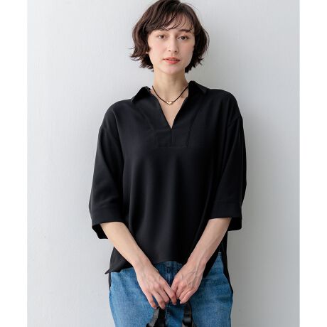 顔周りをすっきりと見せてくれる、前立てにスリットが入ったスキッパーデザインのプルオーバーです。フロントのブザム切り替えがさりげないアクセントになり、シンプルながらも洗練された印象を与えます。しっかりとした仕立てで、襟を少し後ろに抜いて着用することで、より女性らしい抜け感のある着こなしが叶います。今シーズントレンドのスキッパーデザインは、オフィスシーンなどのONスタイルにも取り入れやすく、一枚で様になるアイテムです。同素材のテーパードパンツやワイドパンツなど、きれいめなパンツと合わせた通勤スタイルはもちろん、デニムやワイドパンツと合わせたカジュアルダウンしたスタイリングもおすすめです。カラーは、抜け感のあるダークブラウン(#035)、シックで洗練された印象のブラック(#005)、知的で上品なネイビー(#075)の3色展開です。