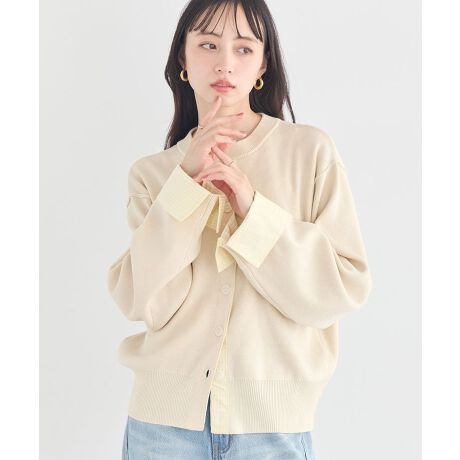 一枚で決まる、大人可愛い重ね着風。まるでシャツを重ねたように見えるフェイクレイヤードデザインが魅力のカーディガンです。袖口からのぞく配色生地がコーディネートのアクセントになり、さりげなくおしゃれ度を高めます。やや肉厚の素材感で安心感があり、季節の変わり目にも重宝します。前開き仕様なので羽織りとしても使いやすく、ボタンを留めてプルオーバー風に着こなすのもおすすめです。パンツにもスカートにも合わせやすく、きれいめからカジュアルまで幅広く活躍します。忙しい朝も一枚でレイヤードスタイルが完成する、着回し力の高いアイテムです。透け感[なし]