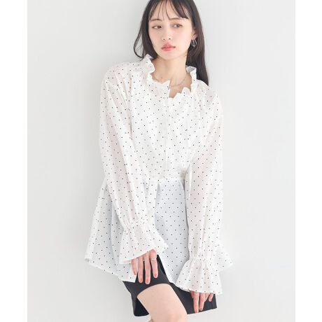 リボンとダブルボタンの上品ブラウス。上質なTRキュプラ素材ならではのしなやかさが魅力です。軽やかで動くたびに美しく揺れ、女性らしい雰囲気を引き立てます。ダブルボタンのディテールがさりげないアクセントになり、シンプルながらも洗練された印象に仕上がります。首元のフリルとリボンが大人可愛いポイントとなり、ジャケットのインナーとしても華やかに映えます。ウエストマークできるデザインでメリハリのある着こなしが可能です。きれいめコーデやオフィスカジュアルにも取り入れやすい万能なブラウスです。※ドット・オフホワイト、やや透け感あり透け感[ややあり]