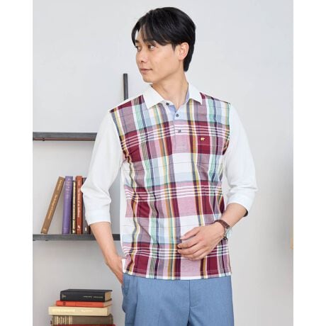 爽やかなチェック柄が目を引く、細部までこだわり抜いた七分袖ポロシャツです。