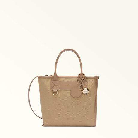 キャンバス生地を使用した、コンパクトで洗練されたレクタンギュラー(長方形)シルエットが特徴です。内側にはアシンメトリーな仕切りや斜めのポケット、ファスナー式コンパートメントを備え、機能美を追求した設計。特別仕様の「Furla Archive」レザータグと、半球型の「スフェラ(Sfera)」メタルチャームが、歴史あるブランドの誇りとコンテンポラリーな輝きを添えています。