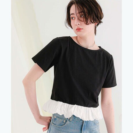 ・デイリー使いにぴったり半袖トップス・カットソー素材に布帛生地のドッキング・裾バルーンシルエットが女性らしさを演出◎・1枚でスタイリングが完成するアイテム[型番:AHXN2411]