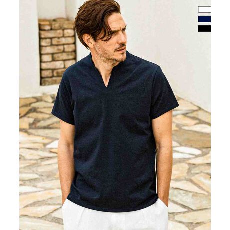 こだわりのパターンで仕立てたキーネックデザインの半袖カットソー。