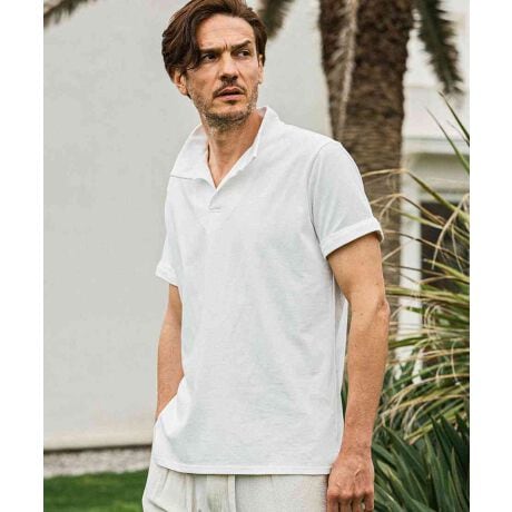 こだわりのパターンで仕立てたイタリアンカラーの半袖カットソー。