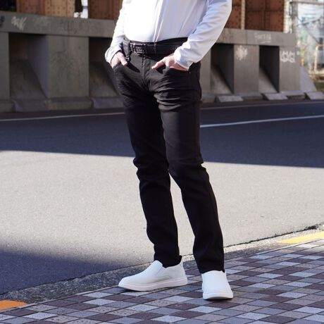 ウエストと腰周りは少しタイトめ調整し、裾口にかけて細くし綺麗なシルエットとなっています