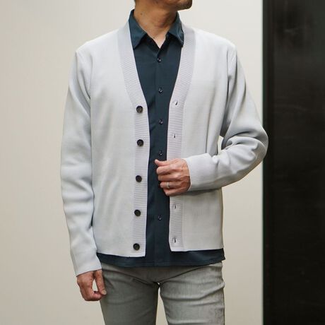 高収縮ポリエステル糸を使用し14ゲージというハイゲージで編み立てたカーディガンになります。