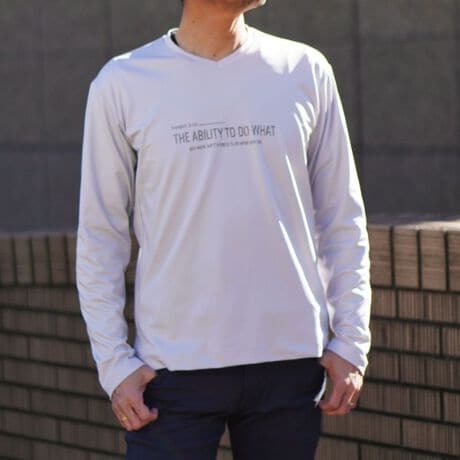 シャープな印象をあたえるメタルジェルプリントが特徴のVネック長袖Tシャツになります。