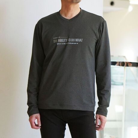 シャープな印象をあたえるメタルジェルプリントが特徴のVネック長袖Tシャツになります。