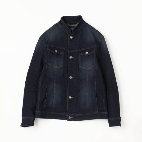 製品加工を施してデニム素材ならではの陰影感を表現しています各ボタンにはブランドロゴ入釦を使用し高級感ある1着となっています。