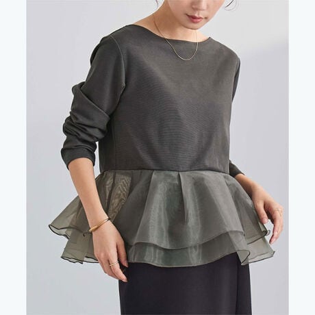 透け感のあるチュールを重ねたペプラムデザインのプルオーバー。