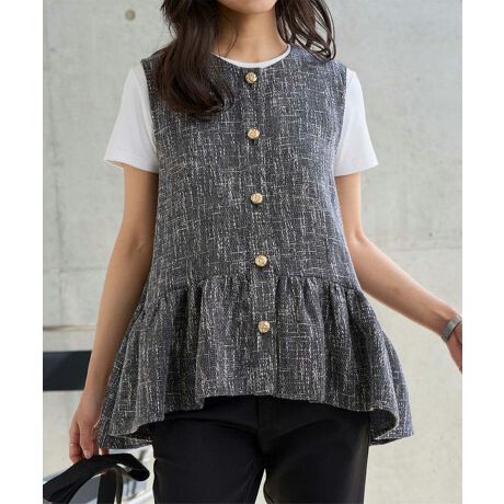 前後差のあるペプラムシルエットが上品で着映えする、ツイードジレ。