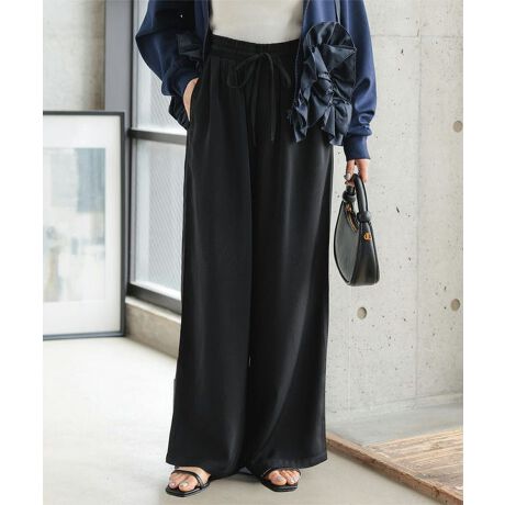 とろみ素材の落ち感が縦ラインを強調し、ワイドでもすっきり美脚見え。