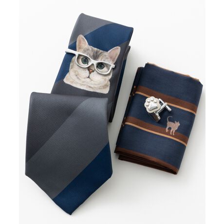 ネクタイの猫ちゃんと合わせるとより存在感が増すメガネデザインは、ほかにはない遊び心。