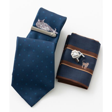 ネクタイの猫ちゃんと合わせるとより存在感が増すメガネデザインは、ほかにはない遊び心。