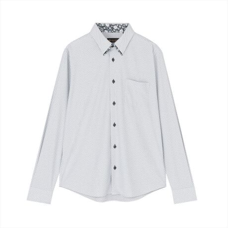 台衿内側とカフス裏の他に、衿羽根にプリント別布を配しモード感を強調したデザインはすっきりしたシルエットでタックイン・アウトどちらでも洗練した雰囲気に。