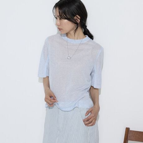 カジュアルになりすぎずにTシャツの代わりに着られる、Tシャツ型のニットプルオーバーです。