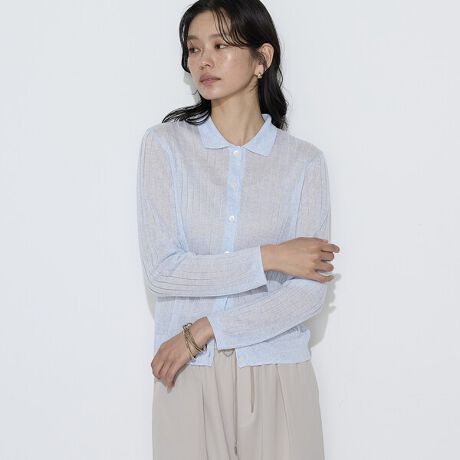 光沢感とシアー感のある素材をワイドリブに編み立て、ポロ襟のデザインにすることでリラクシーなムードと上品なテイストを併せ持ったカーディガンです。
