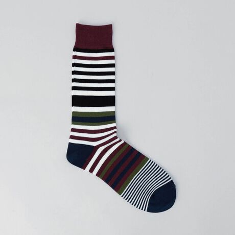 [型番:07-88QO07-206]ポップでマルチカラーのボーダークルーソックスです。トラッドなシーンにもパンツの裾からチラ見せする可愛らしい色が印象的なデザインです。しっかりとしたテンションを持たせた編みで安定した履き心地です。