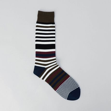 [型番:07-88QO07-206]ポップでマルチカラーのボーダークルーソックスです。トラッドなシーンにもパンツの裾からチラ見せする可愛らしい色が印象的なデザインです。しっかりとしたテンションを持たせた編みで安定した履き心地です。