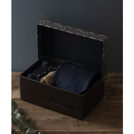 スーツスタイルに欠かせないネクタイからカフスまでをモリスデザインで統一。
