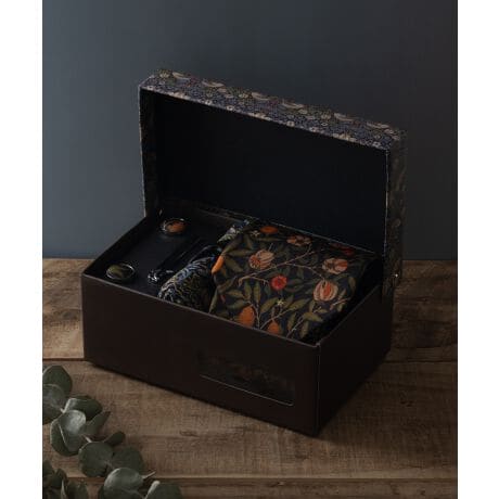 シックなブラウンベースにイチゴ泥棒デザインがあしらわれたボックスにすべてがセットになっています。