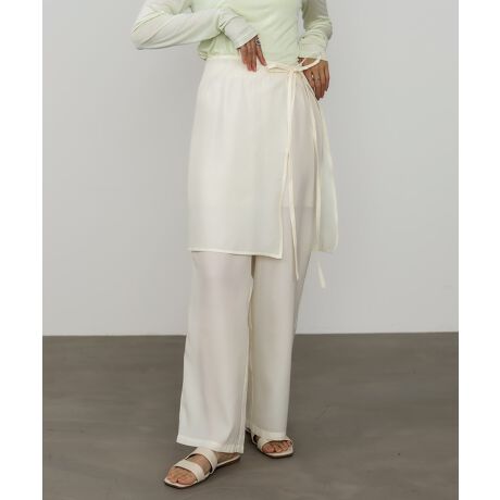 軽やかなシアーパンツにラップ風スカートをレイヤードした、旬なバランスが魅力の一着。サテンのようなほのかな光沢感が上品さをプラスし、シンプルながらもニュアンスのあるスタイリングが完成します。動くたびに揺れるシルエットが、涼しげで女性らしい印象に。