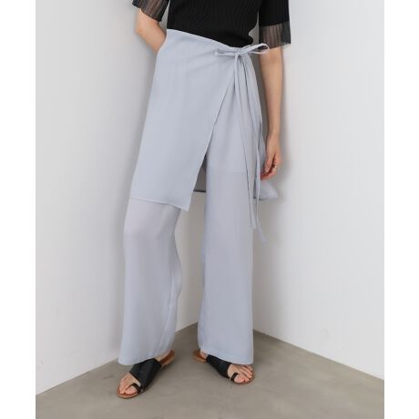 軽やかなシアーパンツにラップ風スカートをレイヤードした、旬なバランスが魅力の一着。サテンのようなほのかな光沢感が上品さをプラスし、シンプルながらもニュアンスのあるスタイリングが完成します。動くたびに揺れるシルエットが、涼しげで女性らしい印象に。