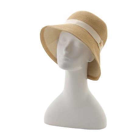 ゴールドのロゴパーツが付いたリボンがさりげなく女性らしさを演出してくれる広つばハット。
