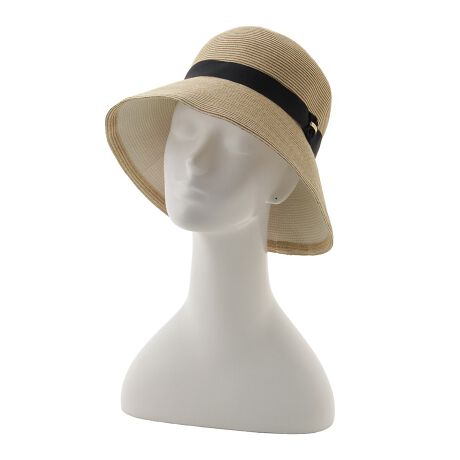 ゴールドのロゴパーツが付いたリボンがさりげなく女性らしさを演出してくれる広つばハット。
