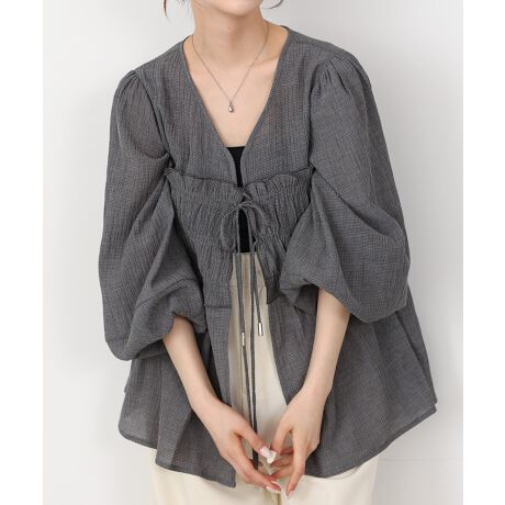 フロントのシャーリングとリボンデザインが目を惹く、フェミニンムードたっぷりのブラウス。ふんわりとしたパフスリーブとややシアーな素材感が軽やかで、1枚でも羽織でもサマになる着映えアイテムです。