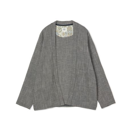 衿のないノーカラーデザインで、軽く羽織るだけでこなれた印象に。背当てには別布をあしらい、見えない部分にもさりげないアクセントを加えています。