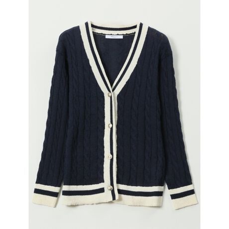 Tシャツの上から気軽に羽織れる、スクール風のニットカーディガンです。すっきりとしたVネック、ゴールド調のエンブレムボタン、太畝のケーブル編み、前立て・袖口・裾部分の配色がポイントになっています。■シルエット
