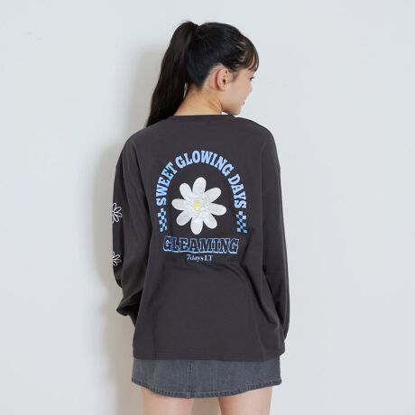 バックに映える大きめのフラワーアップリケが魅力的なTシャツです! 袖にさりげなくプリントをちらして、アクティブな雰囲気の中に程よくガーリーな遊び心をプラス。