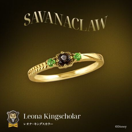 メインストーンにはスモーキークォーツを使い「レオナ・キングスカラー」の髪色を表現し、ライオンのたてがみをイメージした石枠にしています。脇石には瞳のカラーをイメージしたグリーンカラーのキュービックジルコニアを留め、レオナらしい色合いに仕上げ、アームは瞳の傷とサバンナの植物モチーフでアシンメトリーなデザインにしました。裏面にキャラクター名を刻印し、しっかりとレオナの雰囲気が感じられつつ、さりげないデザインでデイリー使いしやすいリングになっています。