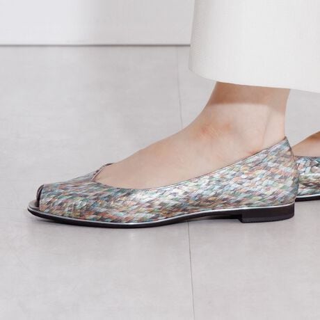 つま先が少しだけ空いたピープトゥは、サンダルとは異なるさりげない肌見せ感が新鮮な一足です。ソールのメタルラインが女性らしさをプラスし、程よいアクセントに。カラーはブラック、アイボリー、マルチの3色展開。立体的なメッシュ柄型押しがレザーの上品な風合いを引き立てます。