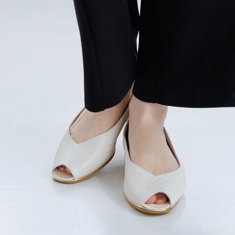 つま先が少しだけ空いたピープトゥは、サンダルとは異なるさりげない肌見せ感が新鮮な一足です。ソールのメタルラインが女性らしさをプラスし、程よいアクセントに。カラーはブラック、アイボリー、マルチの3色展開。立体的なメッシュ柄型押しがレザーの上品な風合いを引き立てます。