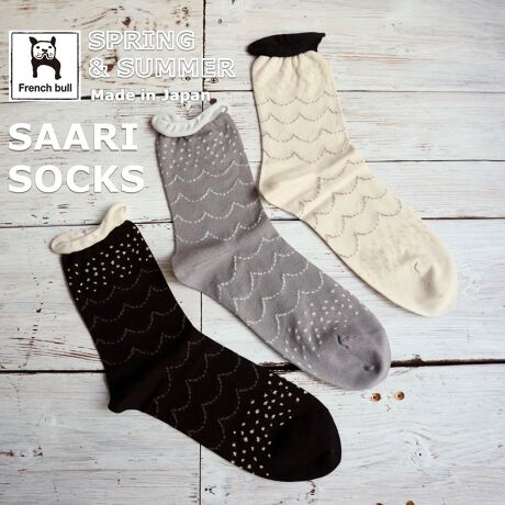 波をモチーフにした柄のソックスです。ベースはガス焼処理により毛羽を抑えたシルケットの綿糸で薄く編み立てました。履き口がくるくるしているので締め付け感が少なく、つま先はリンキング仕様であたりのない快適な履き心地です。柄の一部に使用したラメがポイントに。落ち着いた配色がコーディネートに馴染みの良い1足です。