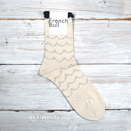 波をモチーフにした柄のソックスです。ベースはガス焼処理により毛羽を抑えたシルケットの綿糸で薄く編み立てました。履き口がくるくるしているので締め付け感が少なく、つま先はリンキング仕様であたりのない快適な履き心地です。柄の一部に使用したラメがポイントに。落ち着いた配色がコーディネートに馴染みの良い1足です。