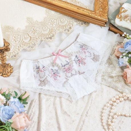 大人気を博した「アリーシャ」が、新しいカラーを加えてリバイバル。イングリッシュローズが咲きほこる、歴史あるヨーロッパのお城をイメージしたシリーズです。建物の優美な装飾を表現したフロントレースは、繊細な幾何学模様の曲線を全体にあしらい、女性らしくも印象的なデザインに。配色は交互にすることで、思わず目をひく華やかさを演出します。中央にはお庭に咲くイングリッシュローズを散りばめ、きらめくラメ糸で豪華に仕上げました。その周りにはメインのお花を引き立てる手描き風のラフなステッチで、お花や曲線のモチーフをほどこして奥行き感をプラス。バックスタイルにはお揃いのアップリケをあしらいました。気品高いエレガントなイメージを身にまとうような、特別感あふれるコレクションです。