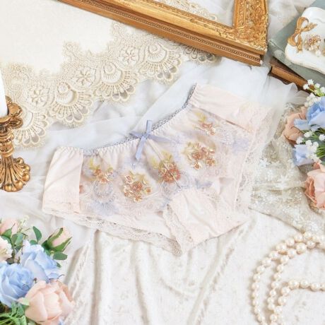 大人気を博した「アリーシャ」が、新しいカラーを加えてリバイバル。イングリッシュローズが咲きほこる、歴史あるヨーロッパのお城をイメージしたシリーズです。建物の優美な装飾を表現したフロントレースは、繊細な幾何学模様の曲線を全体にあしらい、女性らしくも印象的なデザインに。配色は交互にすることで、思わず目をひく華やかさを演出します。中央にはお庭に咲くイングリッシュローズを散りばめ、きらめくラメ糸で豪華に仕上げました。その周りにはメインのお花を引き立てる手描き風のラフなステッチで、お花や曲線のモチーフをほどこして奥行き感をプラス。バックスタイルにはお揃いのアップリケをあしらいました。気品高いエレガントなイメージを身にまとうような、特別感あふれるコレクションです。