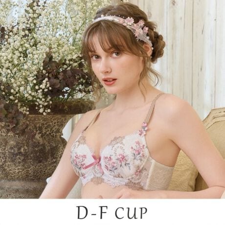 大人気を博した「アリーシャ」が、新しいカラーを加えてリバイバル。イングリッシュローズが咲きほこる、歴史あるヨーロッパのお城をイメージしたシリーズです。建物の優美な装飾を表現したレースは、繊細な幾何学模様の曲線を全体にあしらい、女性らしくも印象的なデザインに。配色は交互にすることで、思わず目をひく華やかさを演出します。カップにはお庭に咲くイングリッシュローズを散りばめ、きらめくラメ糸で豪華に仕上げました。その周りにはメインのお花を引き立てる手描き風のラフなステッチで、お花や曲線のモチーフをほどこして奥行き感をプラス。ストラップにはお揃いのアップリケをあしらいました。気品高いエレガントなイメージを身にまとうような、特別感あふれるコレクションです。