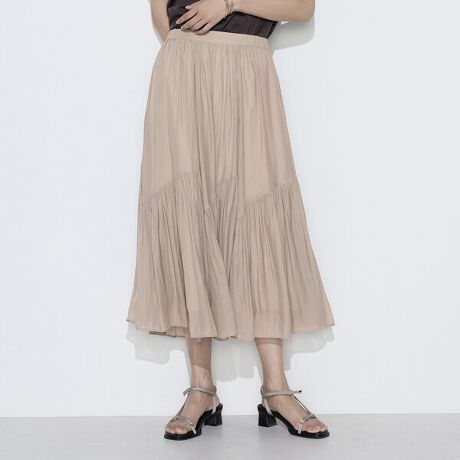 膝下にはアシンメトリーの切り替えを入れ、そこから広がるギャザーが歩くたびにやわらかな動きを生み出します。