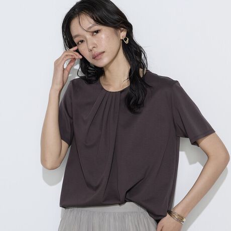 首元のアシンメトリータックがさりげないアクセントを添えるフレンチスリーブTシャツです。