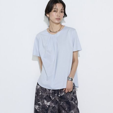 首元のアシンメトリータックがさりげないアクセントを添えるフレンチスリーブTシャツです。
