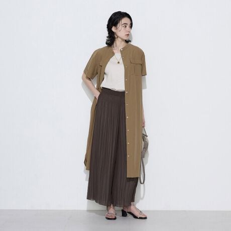 身体のラインを拾い過ぎないIラインシルエットで快適に着られ、裾は丸みを持たせたカッティングにより抜け感を演出しています。