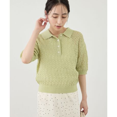 ・繊細なウェーブ状の透かし編みがさりげない表情をプラスし、顔まわりを華やかに見せるクラシカルなポロ衿が特徴。