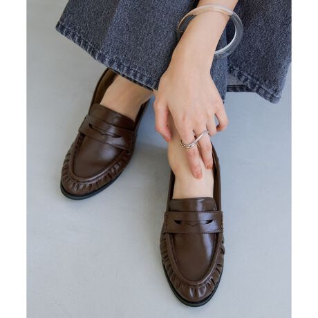 シンプルなローファーデザインにギャザーを入れ、トゥ先を少しポインテッドぎみにすることでレディライクな仕上がりに。