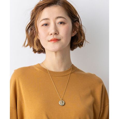 丸みのある天然石のトップに直線的なゴールドのバー金具をあしらった、異素材のコントラストが美しいネックレスです。自然な風合いが魅力の天然石と、光沢のある金属パーツを組み合わせています。天然石が持つ唯一無二の模様や色合いが、シンプルなコーディネートに奥行きと個性をプラス。天然素材を使用しているため、石の模様や色味には一点一点個体差があり、それぞれの石が持つ豊かな表情をお楽しみいただけます。肌馴染みの良いゴールドカラーのチェーンは繊細な輝きを放ち、大人の女性にふさわしい上品な仕上がりです。スライドボール仕様によりチェーンの長さをスムーズに調整できるため、合わせるトップスの襟ぐりやその日の気分によって自在にアレンジを楽しめるのが魅力です。ハイネックのトップスの上から長めに着けたり、シャツの胸元に合わせて短めに調整したりと、オンオフ問わず多彩なスタイリングにマッチします。カラーは、縞模様が美しく柔らかい印象のダークブラウン(035)、白地に黒の斑点がモダンな印象のモノトーン(#305)、深みのある色合いがシックで落ち着いたダークグリーン(#365)、乳白色が優しげで洗練されたアイボリー(#002)の4色展開です。