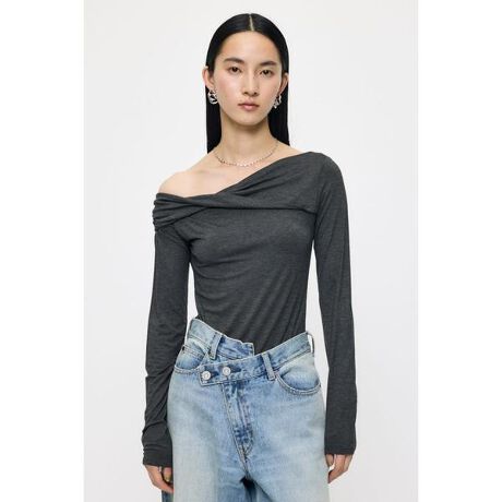 【ASYMMETRY TWIST NECK TOP/ アシンメトリー ツイスト ネックトップス】■ポイントアシンメトリーなネックラインが印象的なワンショルダーカットソー。デコルテを美しく引き立てるドレープデザインが、シンプルながらも洗練された存在感を放ちます。ヘルシーさとモード感を兼ね備えた一枚。■ディテール柔らかく肌に寄り添うカットソー素材を使用し、程よいフィット感で女性らしいシルエットを演出。肩部分にはさりげないツイストディテールを施し、立体感のある表情に。長めのスリーブが全体を引き締めます。■スタイリングワイドパンツと合わせてミニマルに、タイトスカートでレディに。デニムと合わせた抜け感のある着こなしもおすすめです。